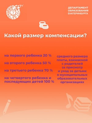 Уважаемые родители (законные представители), информируем вас, что предоставление муниципальной услуги «Выплата компенсации в части родительской платы за присмотр и уход за детьми» осуществляется при наличии справки о среднедушевом доходе семьи для назначения компенсационной выплаты: 20% на первого ребенка, 50% на второго, 70% на третьего, 100% на четвертого при наличии 1,5 величины прожиточного минимума на члена семьи.